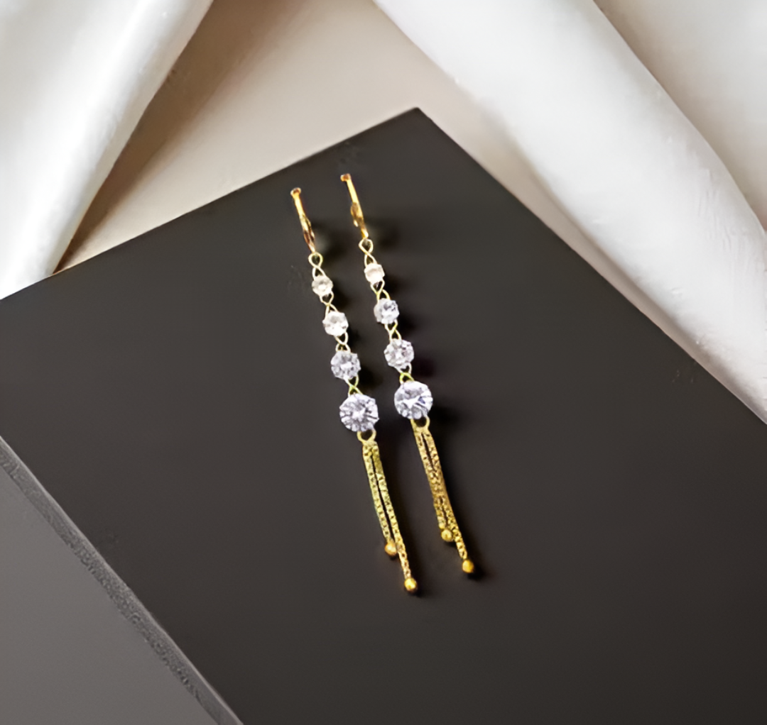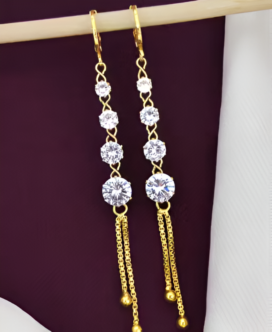 ๐ Add a touch of luxury to your look with these stunning Gold & Crystal Drop Earrings!๐ Featuring sparkling crystal stones linked with a sleek golden finish, they bring timeless elegance to every outfit.ย Perfect for parties, weddings, or festive occasions, these earrings are lightweight, classy, and designed to shine with every move.๐ A perfect gift for someone specialโor yourself!