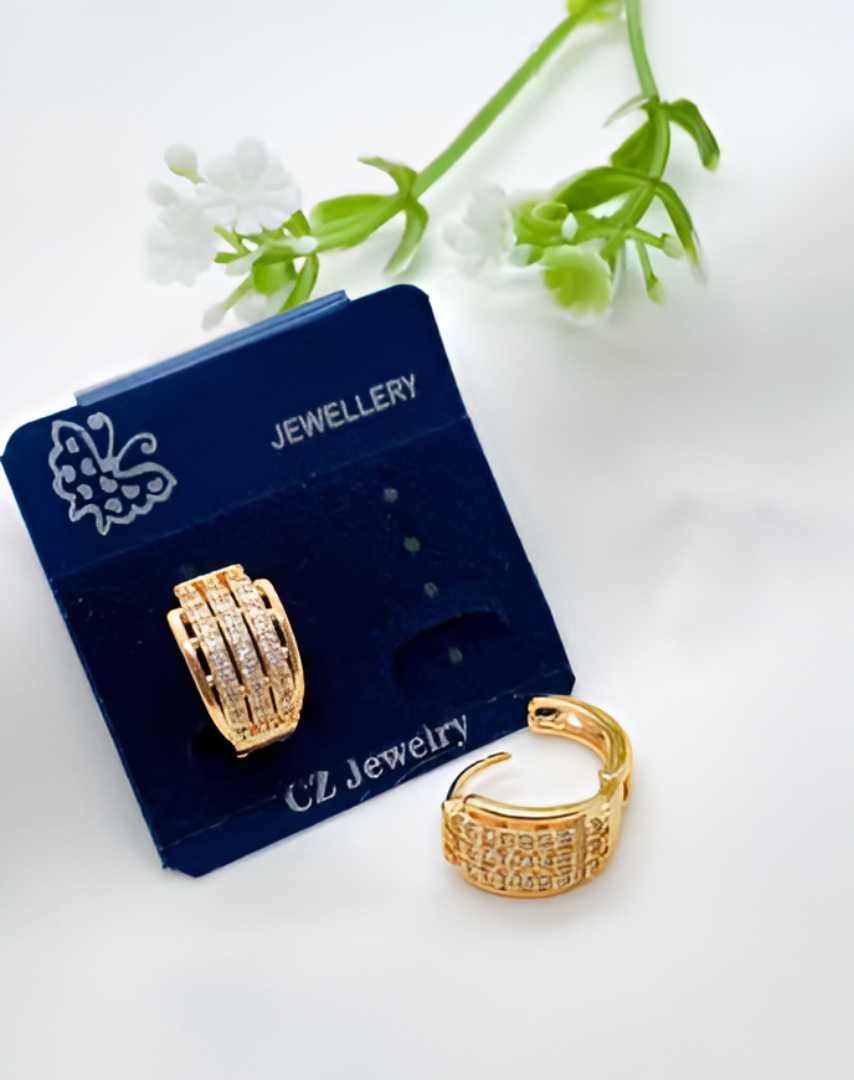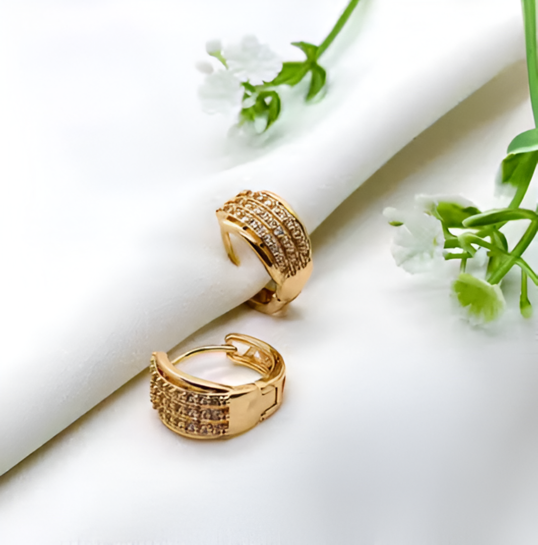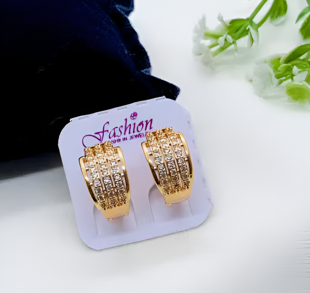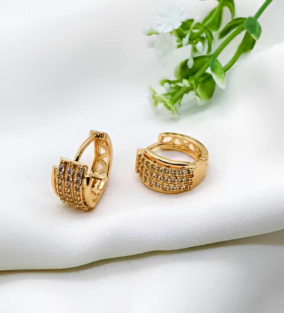These stunning gold-plated hoop earrings combine modern elegance with timeless charm. โจ Crafted with precision, each earring features three shimmering crystal-studded rows that add a touch of sparkle to your everyday or festive look. ๐ Their compact, classy design makes them perfect for both casual wear and special occasions. Lightweight and comfortable, theyโre a must-have addition to your jewelry collection. ๐